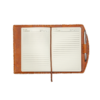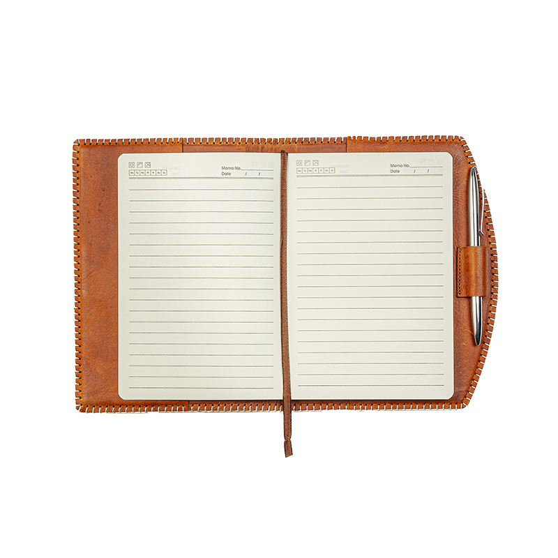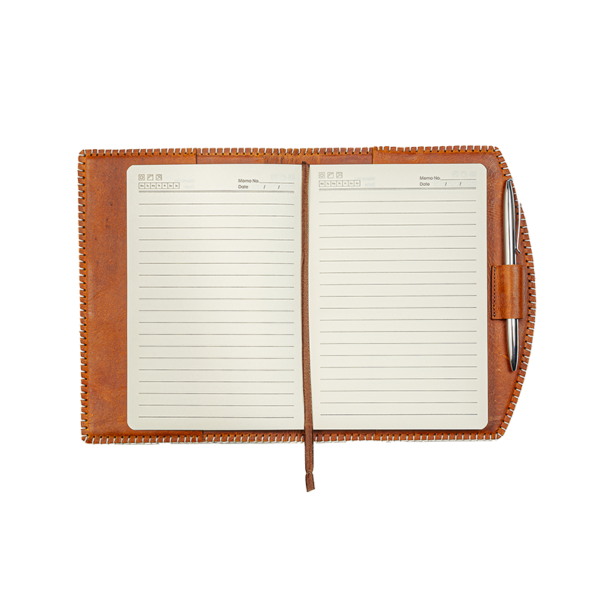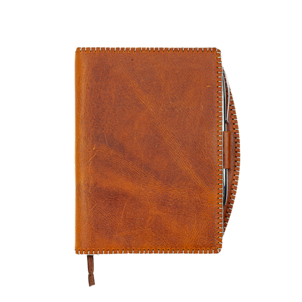 Porta agenda de cuero natural con orilla cocida a mano, incluye lapicero metálico plateado y cuaderno tipo agenda 16 x 23 cm.