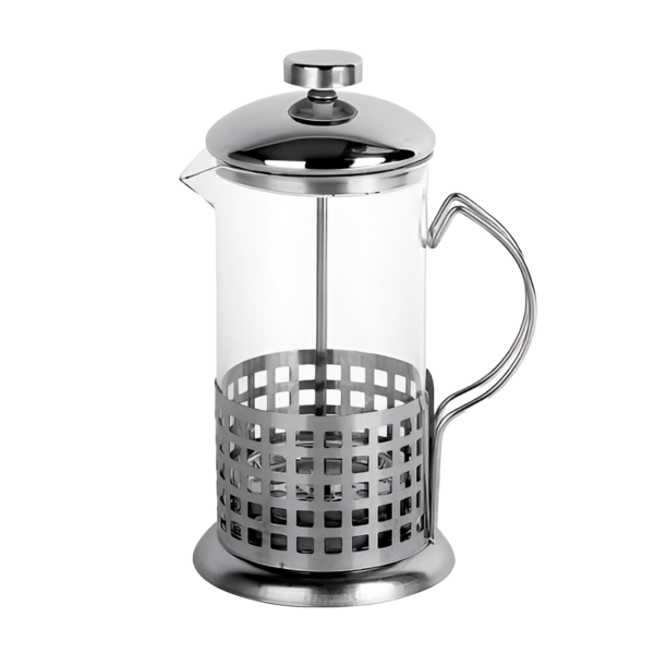 Prensa francesa de vidrio con borde y agarrador metal color plateado 350 ml.