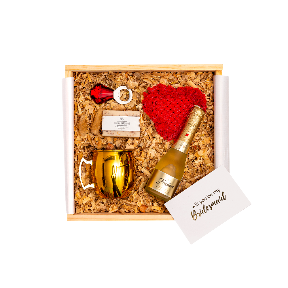 Empacado en caja de madera con tapa deslizable grande. Papel de relleno, listón, tarjetas personalizables y flor natural seca.