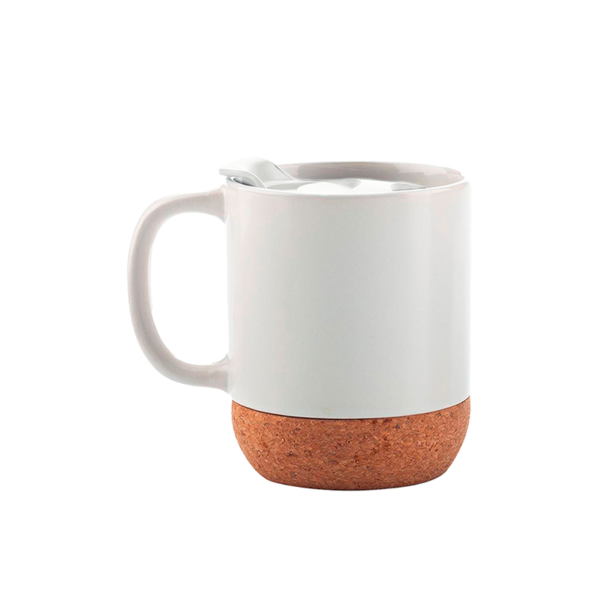 Taza de cerámica blanca con base de corcho y tapa plástica.