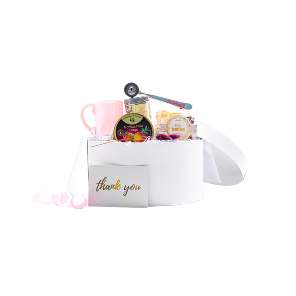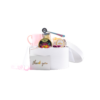 Empacado en caja premium tipo sombrero redonda color blanco grande. Papel de relleno, listón, tarjetas personalizables y flor natural seca.