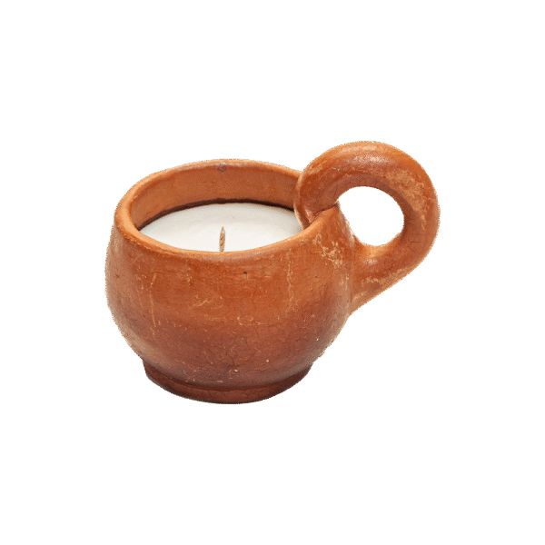 Vela de soya en recipiente artesanal de barro en forma redonda con sujetador a un costado tamaño mediano.