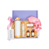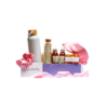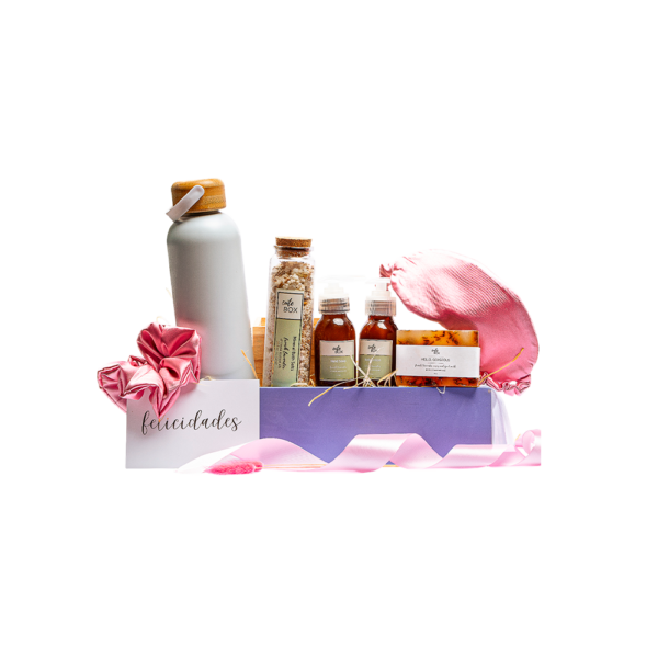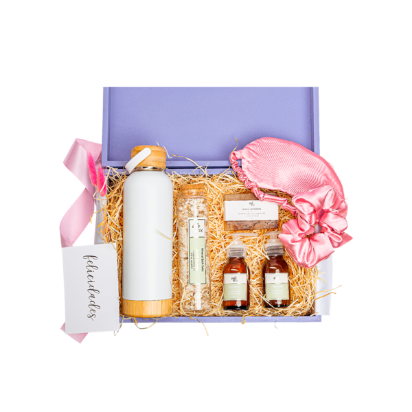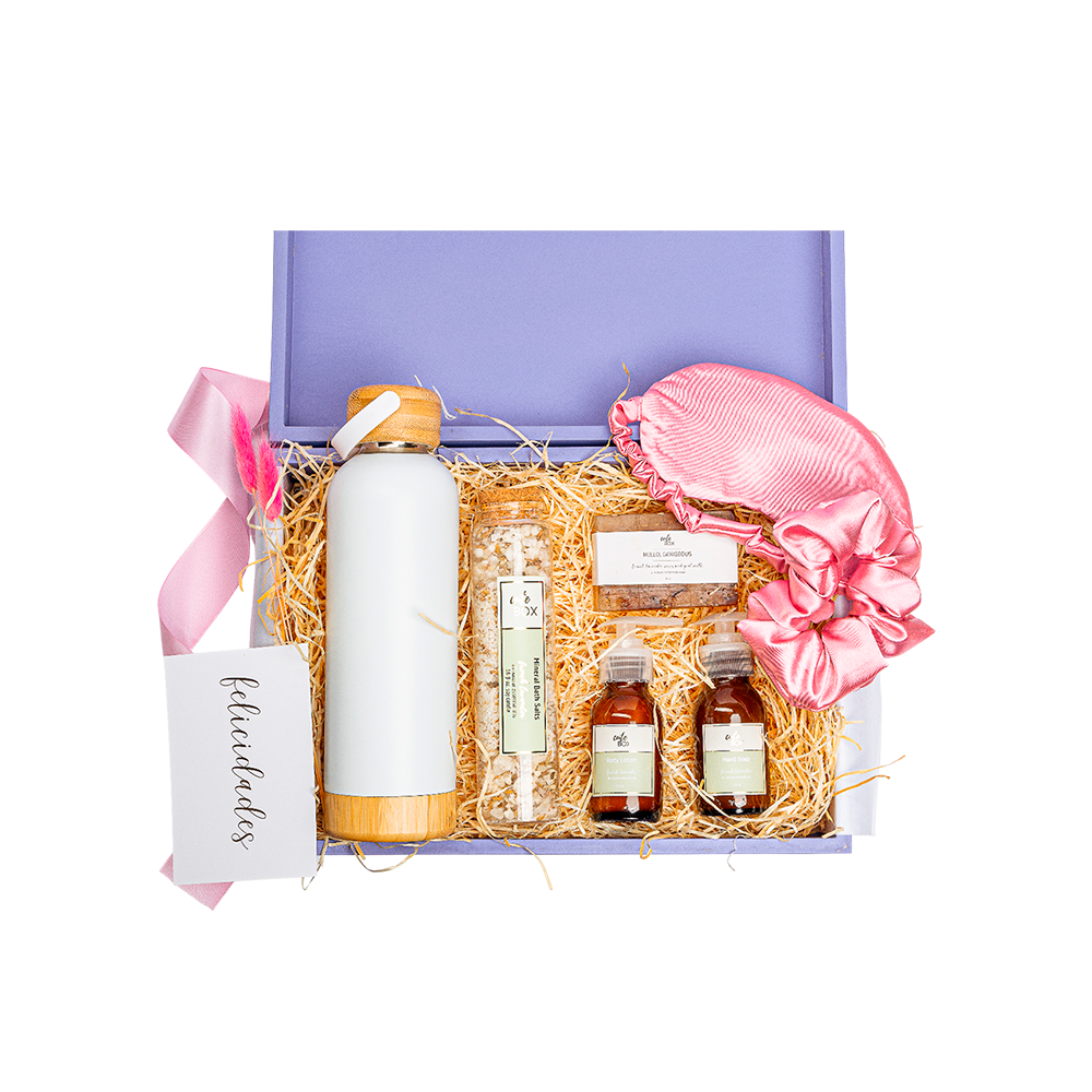Empacado en caja de madera tipo cofre pintada en color lila grande. Papel de relleno, listón, tarjetas personalizables y flor natural seca.